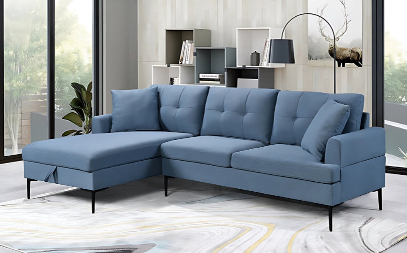 Profitez d'un espace de détente confortable avec le canapé en chaise longue à main gauche. Avec une grande zone de rangement, un rembourrage boutonné et des pieds en métal noir, ce canapé est à la fois pratique et élégant. Les coussins décoratifs et le tissu bleu doux ajoutent une touche de couleur et de confort supplémentaire.