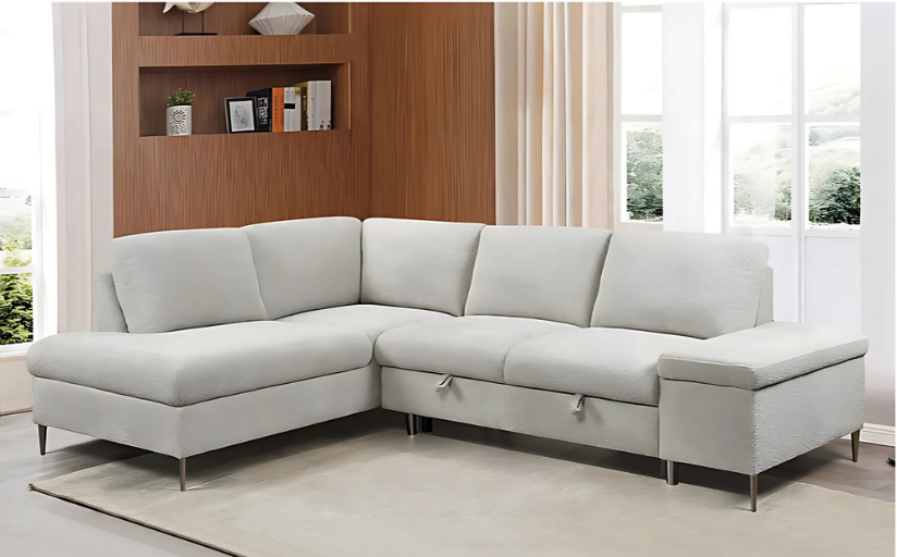 Le canapé lit beige en tissu bouclé est doté d'une chaise avec rangement et s'ouvre en un grand lit confortable. Avec une longueur de 104", une largeur de 76" et une hauteur de 34", ce canapé est parfait pour les espaces de vie modernes.