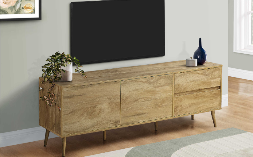 Rendez une déclaration dans votre salon, salle de famille ou chambre à coucher avec ce support de télévision tendance dans un design du milieu du siècle avec une finition stratifiée en noyer clair. Avec son style rétro, ce meuble TV de 72 pouces est à la fois chic et fonctionnel. Doté de pieds en bois massif et d'un dessus facile à nettoyer, il est conçu pour durer. Les 2 tiroirs de rangement faciles à glisser et les 2 armoires avec étagère réglable dans chaque compartiment vous aident à garder vos médias organisés et hors de vue. Le mécanisme de fermeture à pression ajoute une touche moderne, tandis que les 2 trous de gestion des câbles à l'arrière permettent de garder les cordons en ordre. Ce meuble TV au style tend