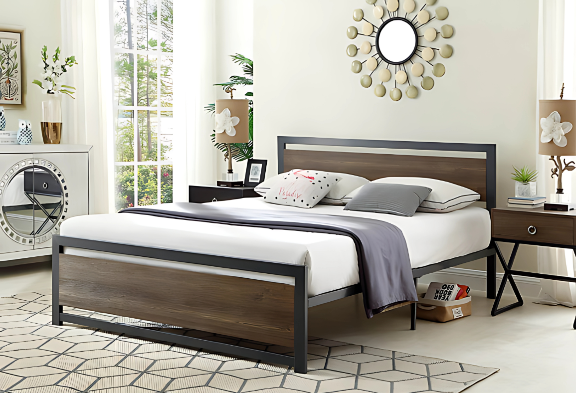 ce lit en métal gris avec une tête de lit en bois pour une touche de chaleur et de style. Laissez-vous séduire par ce lit moderne et élégant pour une nuit de sommeil confortable et paisible.