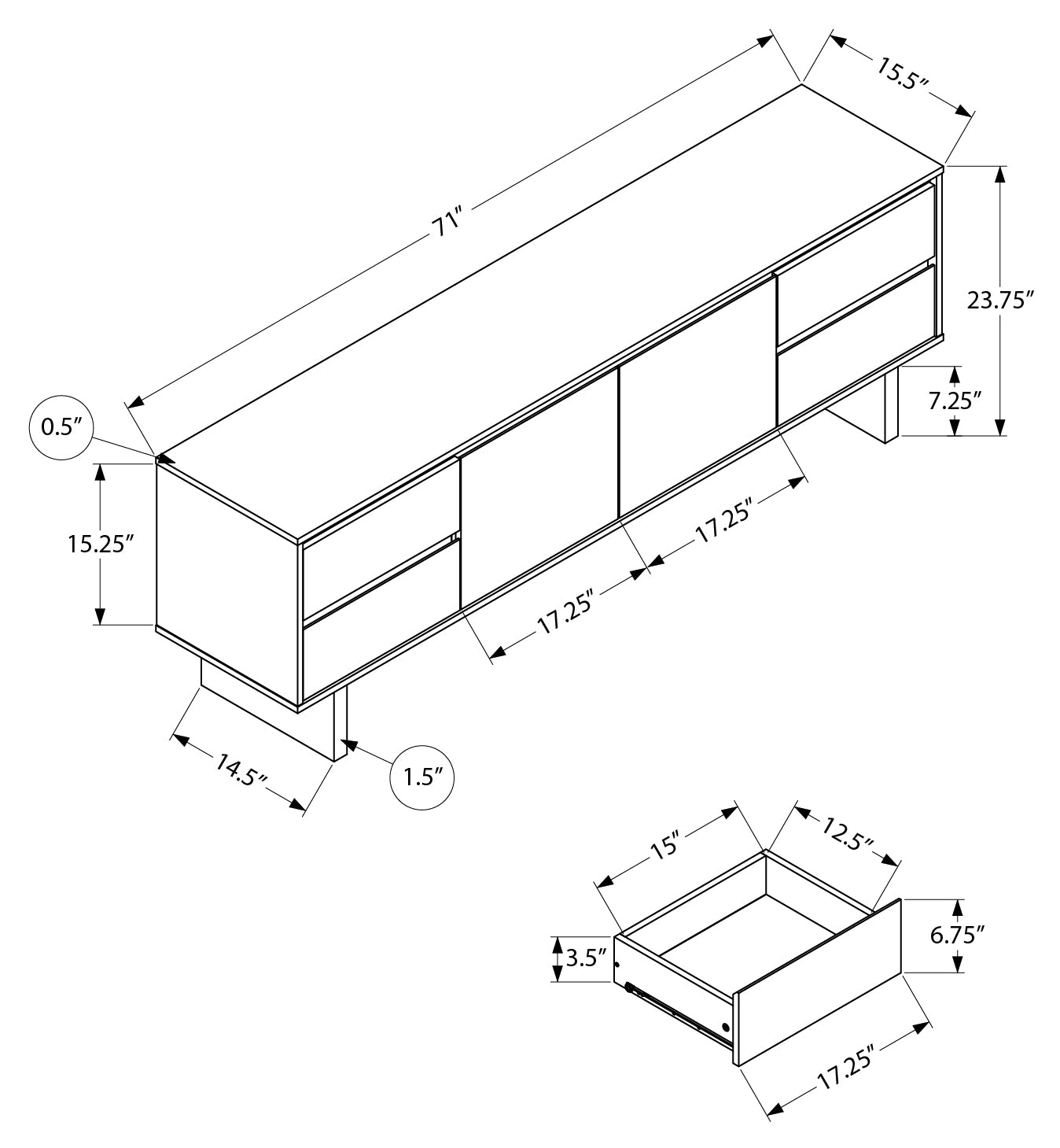 Modernisez votre expérience de divertissement avec notre meuble TV tendance de 72 pouces en stratifié marron foncé élégant, avec une finition aspect bois sur tous les côtés. Cette console de style transitionnel comporte quatre tiroirs de rangement fermés et un meuble de rangement avec étagères réglables pour que vos éléments multimédia soient organisés et facilement accessibles. Fabriqué avec une construction solide et conçu de manière durable avec des pieds épais et des matériaux de qualité pour une utilisation durable. Le mécanisme de fermeture par pression des options de rangement lui confère un aspect propre et contemporain, tandis que le dessus facile à nettoyer facilite l'entretien. Avec 4 trous de gestion des câbles situés au centre et des instructions d'assemblage étape par étape avec toute la quincaillerie incluse, ce centre de divertissement multimédia facile à assembler est parfait pour ceux qui apprécient à la fois le style et l'aspect pratique. Une garantie limitée de 5 ans est incluse pour une plus grande tranquillité d'esprit. Améliorez votre salon, votre chambre à coucher ou votre salle familiale avec ce meuble TV de style tendance qui ne manquera pas de rehausser votre installation de divertissement à domicile.