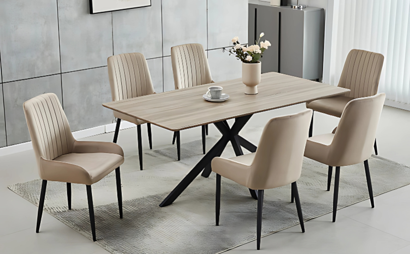 Profitez d'une expérience culinaire élégante avec notre ensemble de table en bois et de chaises en velours beige. La table offre une surface durable et les chaises en velours ajoutent une touche de sophistication avec des détails de couture. Le tout est soutenu par des jambes en acier noir pour le style et la solidité.